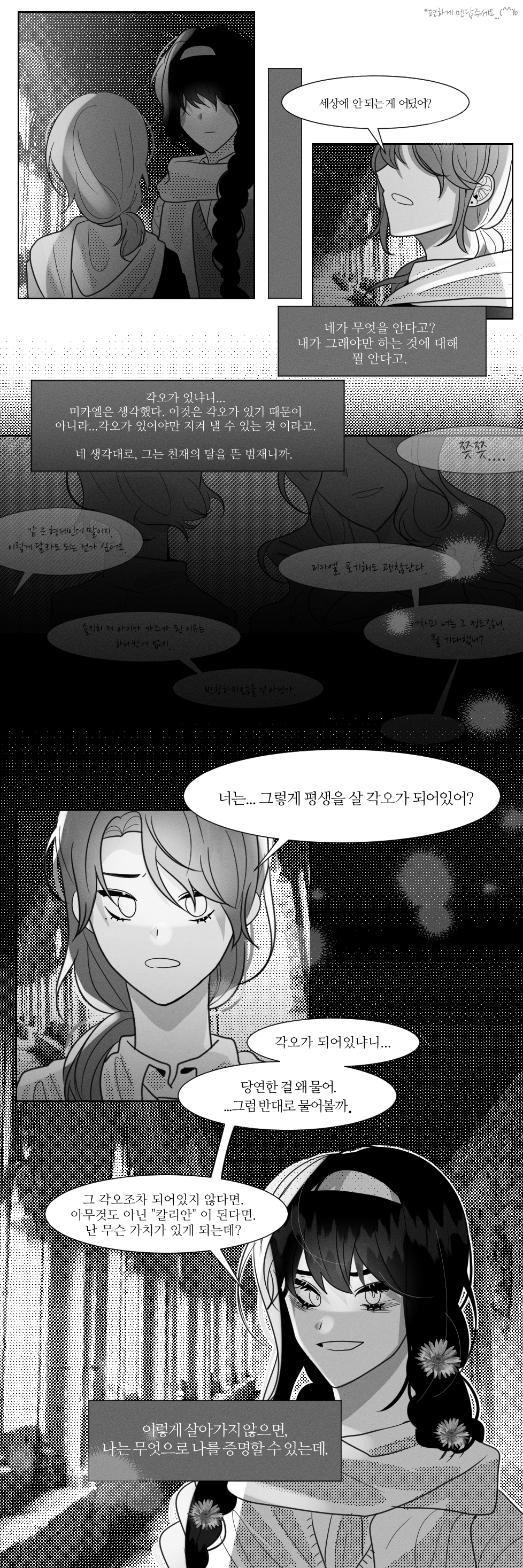 미카엘은 그 무엇도 알 수 없었다. 이것이 닳고 닳은 이야기 라는 것도, 그 누군가는 이해 할 수 없다는 것도. 그 어떠한 사람이 듣기에는 곧 지쳐 쓰러져 버릴 것 만 캍은 사람의 얼굴과 다름이 없다는 것도...